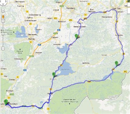 Am 2.Tag ging`s wie auf der Karte zu sehen zum Walchensee und weiter über die Wildflusslandschaft Isartal (Mautstrasse) zurück nach Garmisch.